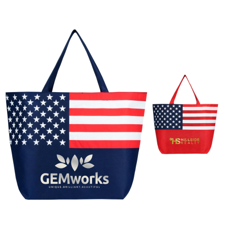 Promotional Products Similar to the Customized American Flag Non-Woven Tote Bag 13x20x8 - Metallic imprint: