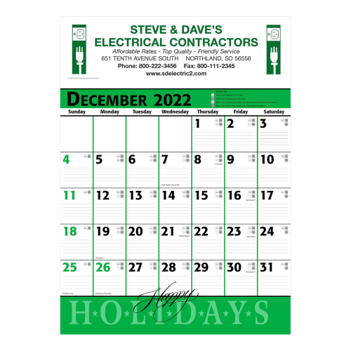 Customized Commercial Planner Wall Calendar - Green & Black is available for customized your logo on any of our thousands of advertising handouts. Enjoy custom giveaways like the Promotional Commercial Planner Wall Calendar - Green & Black and other Branded Calender...