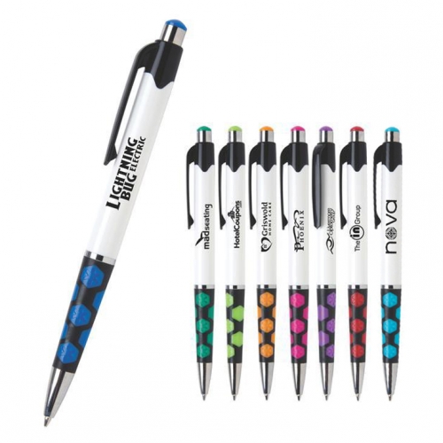 Customized Mardi Gras Hex Click Pen and other Promotional Click Pens without paying for setups (for VIP customers). Custom Mardi Gras Hex Click Pen can be customized with your company logo for marketing with free setups (see our VIP Program).