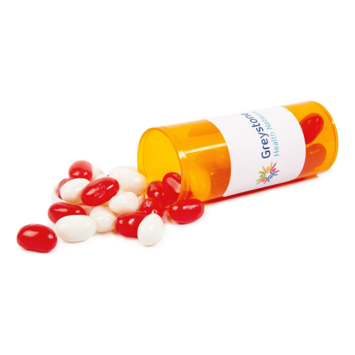 Customized Small Promo Pill Bottles-Jelly Belly and other Promotional Candies with free setups (see our VIP Program). Custom Small Promo Pill Bottles-Jelly Belly can be printed with your business logo for marketing with free artwork eproofs.